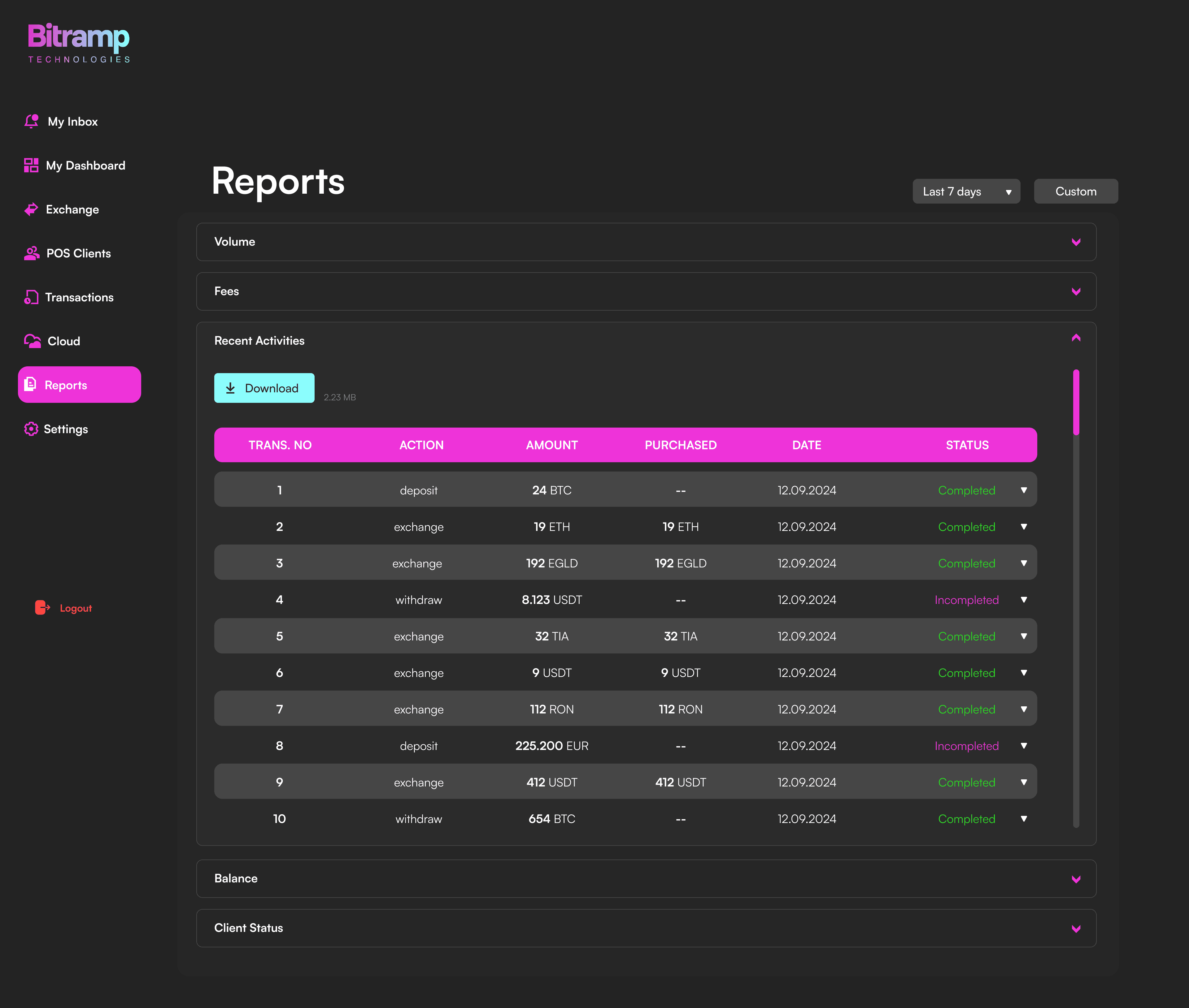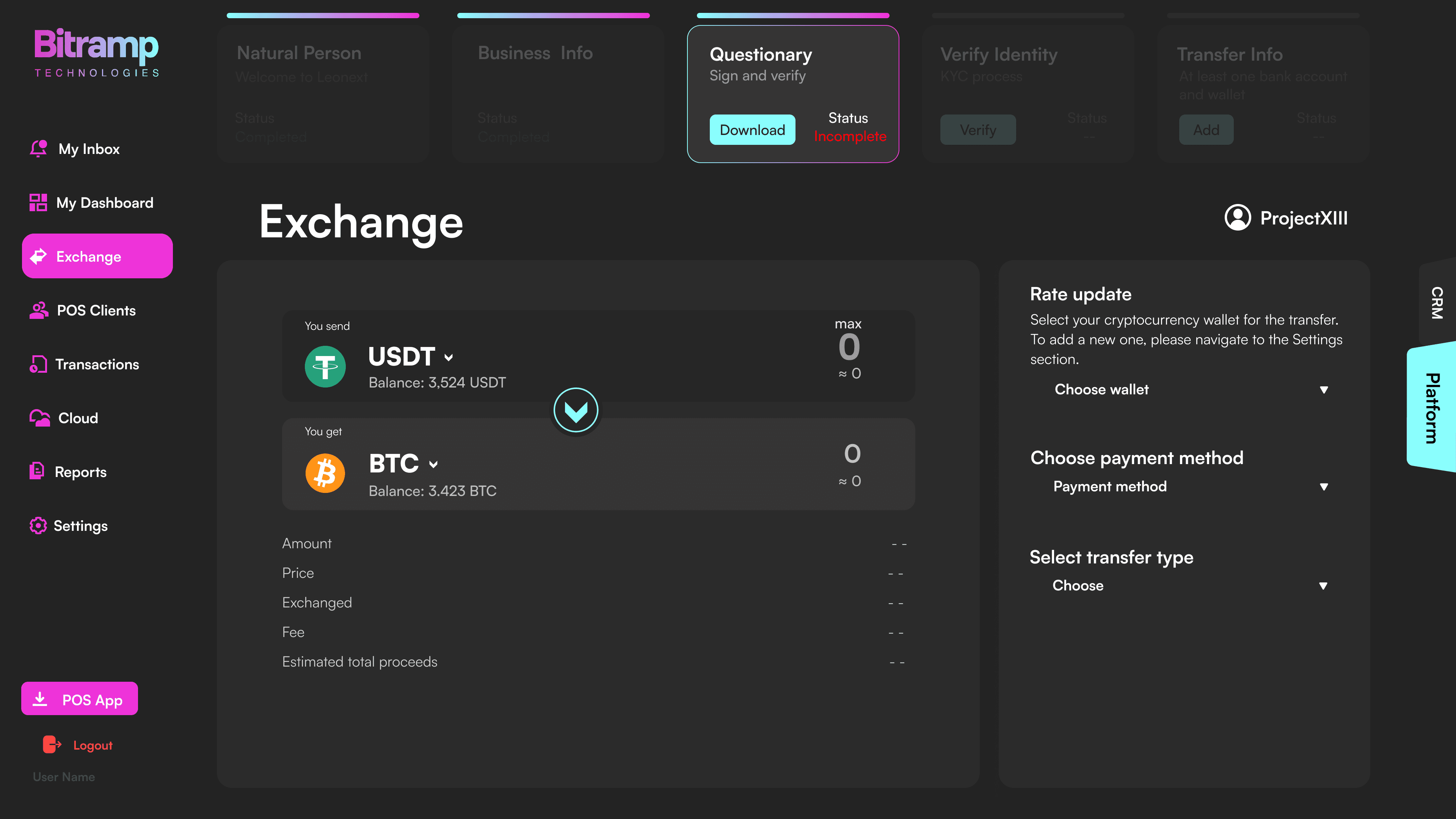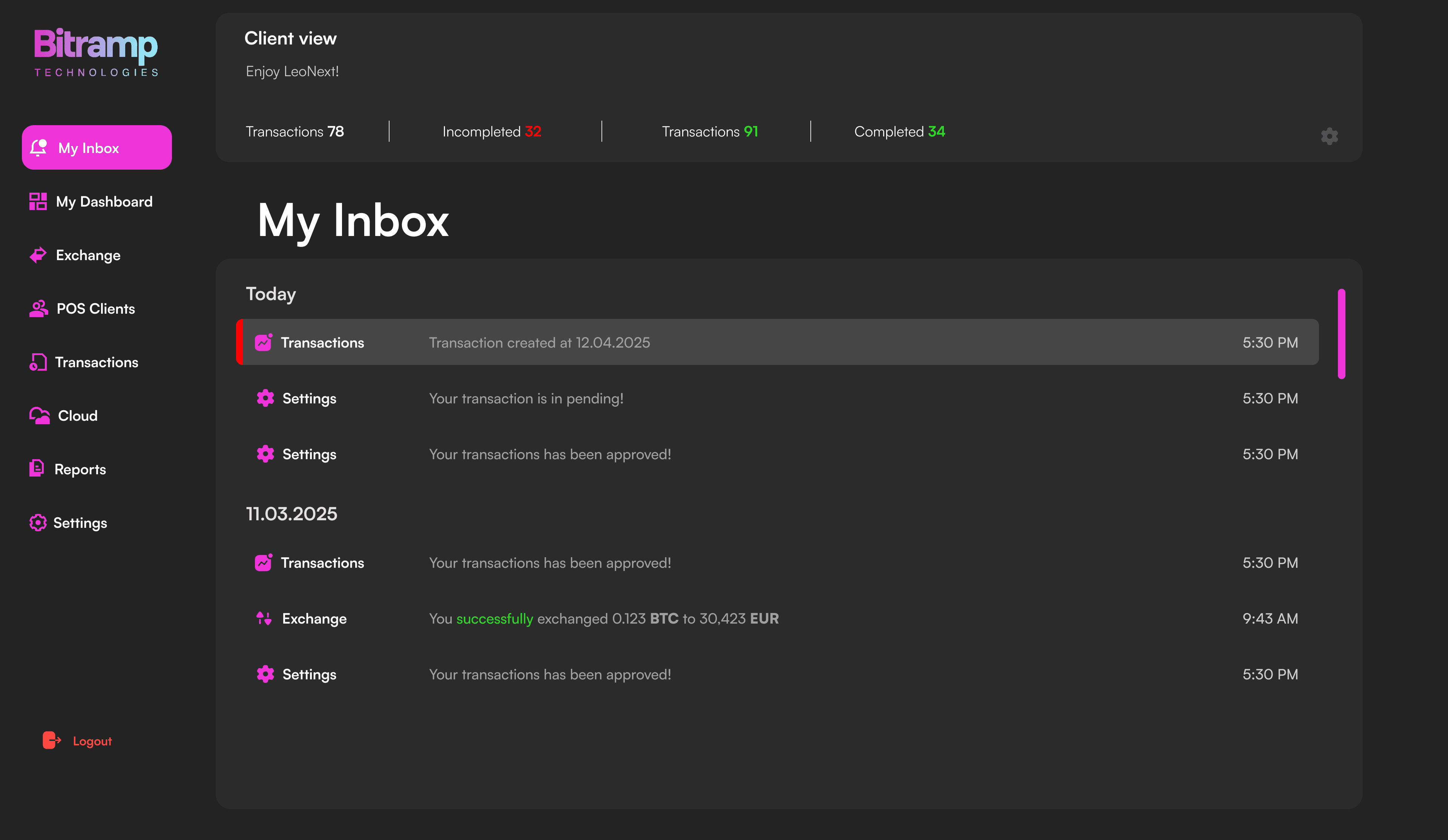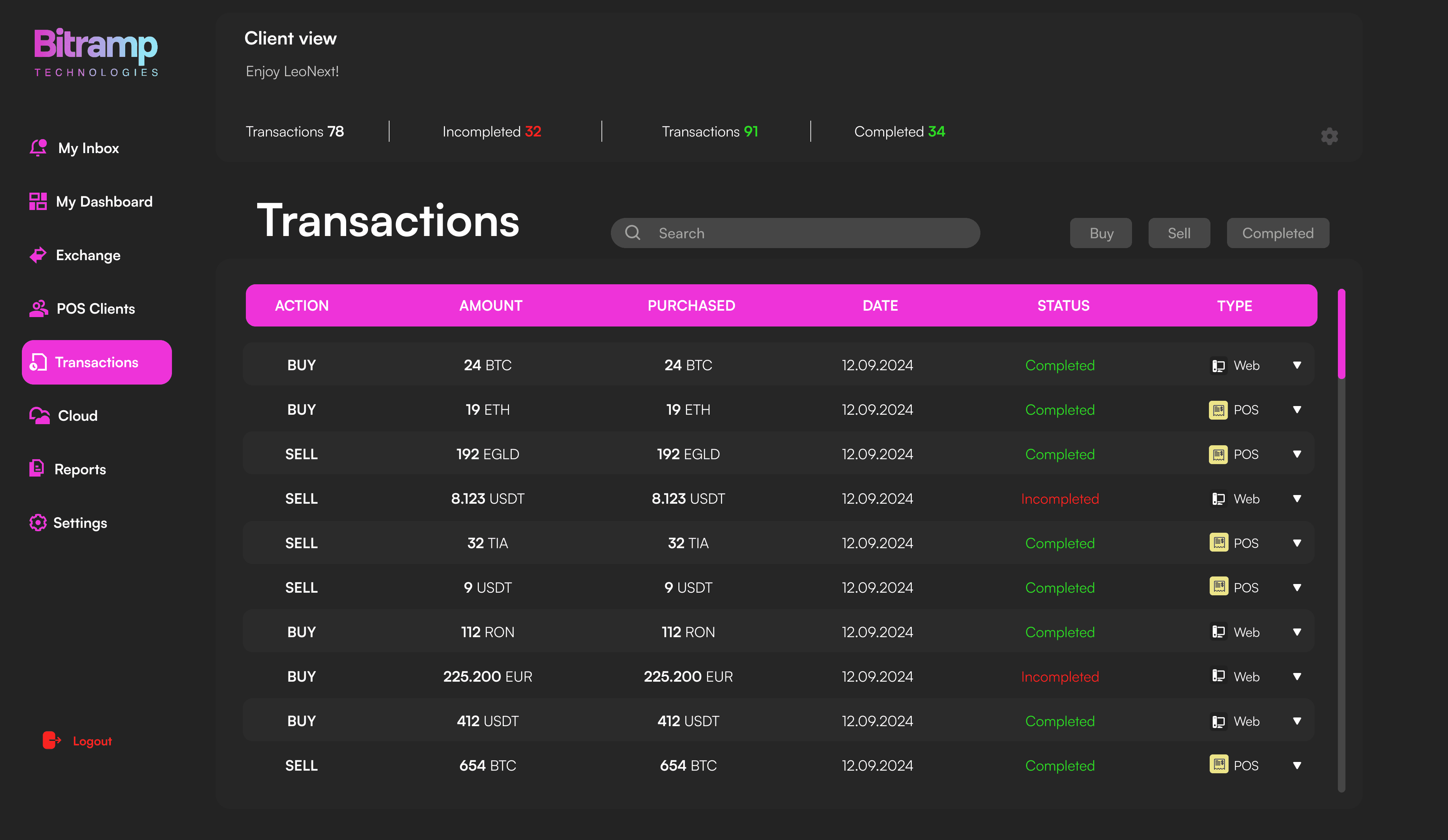 Bitramp Platform, combined with Bitramp Swipe‘n’Swap (SNS) and the Bitramp CRM, enables unified management of client interactions, transaction monitoring, and compliance workflows across digital and physical crypto exchange environments.