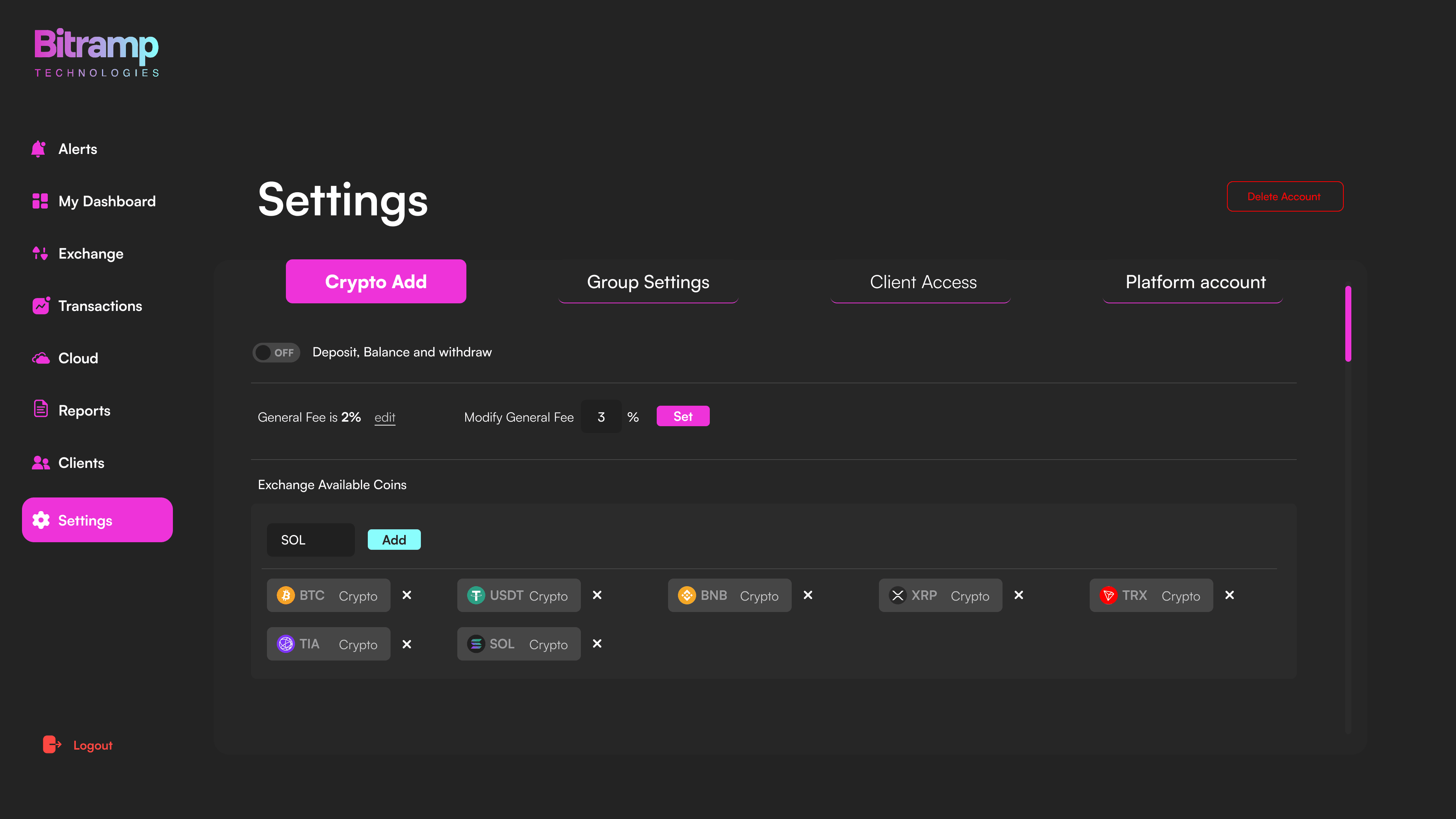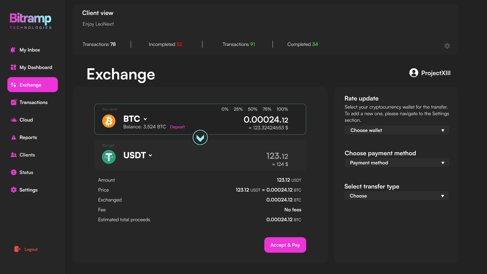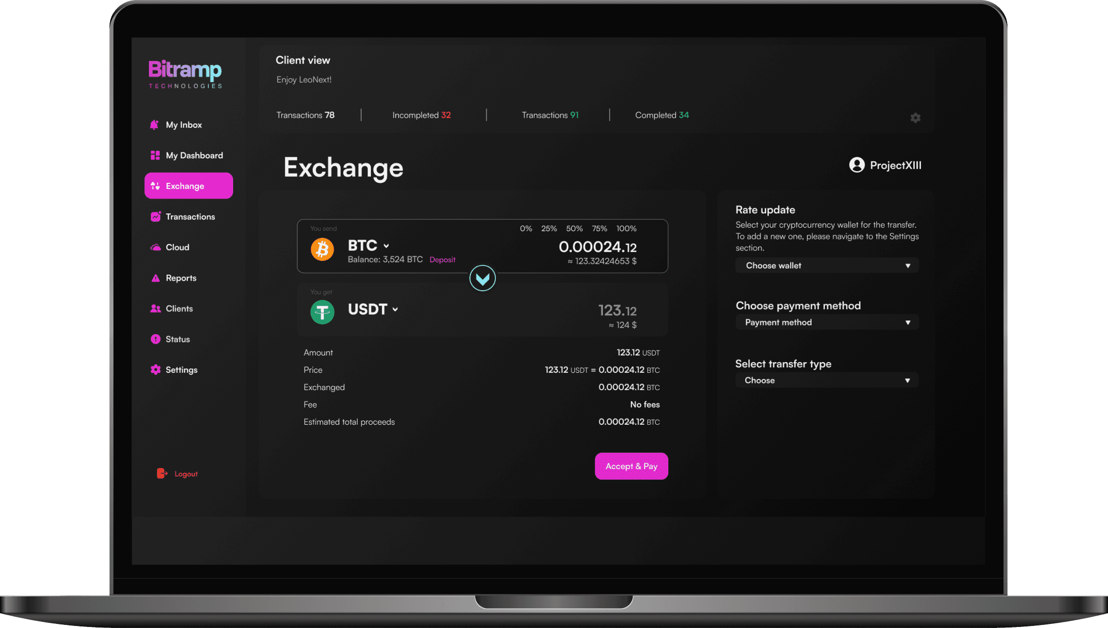 The Bitramp Platform is a B2B and high-net-worth individual (HNWI) crypto-fiat conversion platform designed to deliver institutional-grade security, compliance, and robust multi-currency support. Built for sophisticated users, it meets the demanding needs of businesses and HNWI’s through seamless integrations and cutting-edge technology.